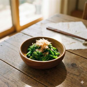 味付けは鶏ガラスープの素をベースに、ほんの少しの砂糖(ひとつまみ)を加えると、菜の花の苦味の角が取れ、優しくまろやかな味わいになります。忙しい朝のお弁当作りにも、この一品があるだけで彩りは完璧。庭で収穫したばかりの菜の花で作るこの一皿は、私にとっても春の訪れを感じる特別な儀式のようなものです。